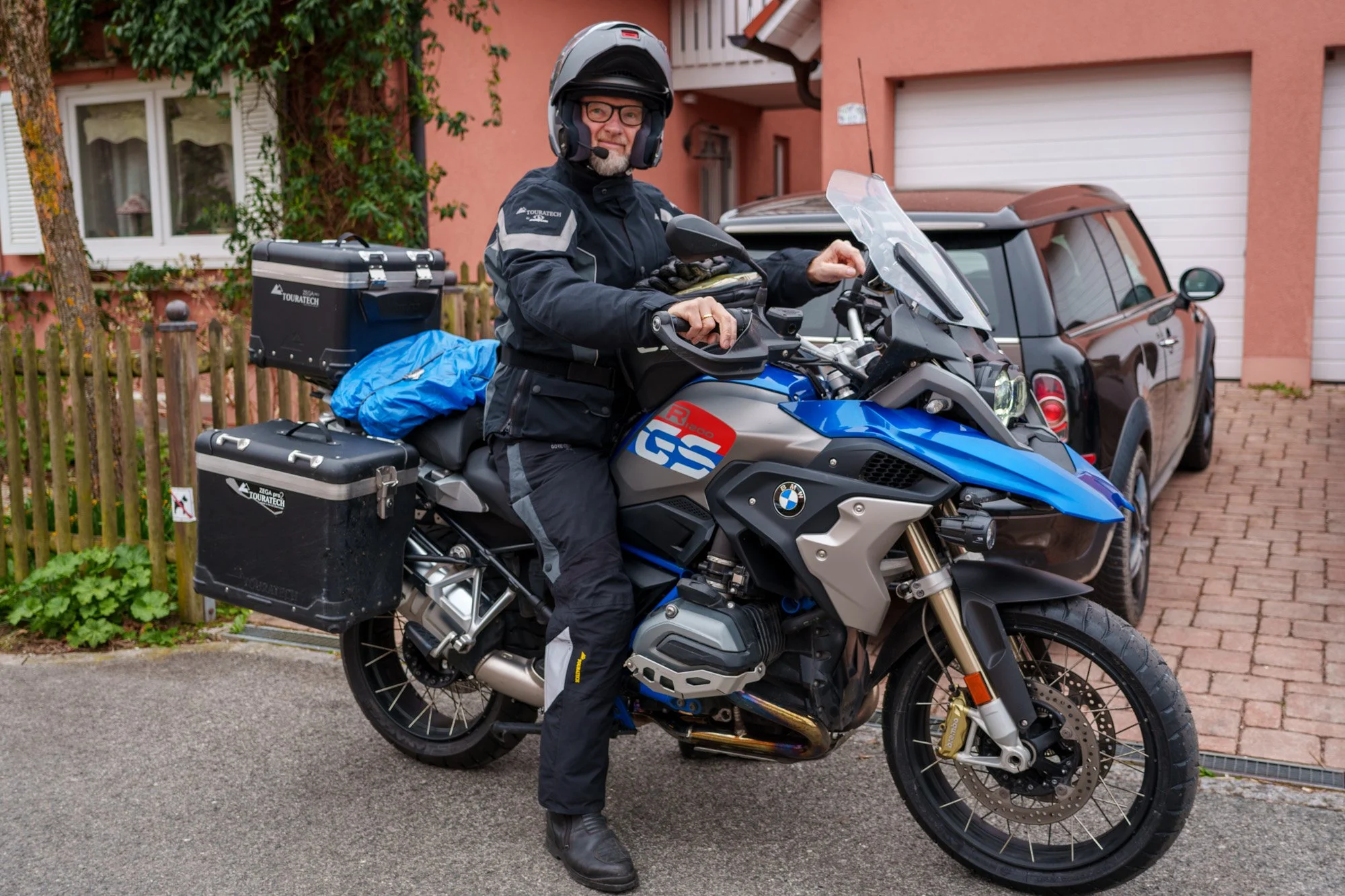 R. hat seine BMW R1200GS an den Tagen vor der Abreise geputzt, sämtliche Funktionen überprüft und das Garmin Navi auf den neuesten Stand gebracht und beim TÜV noch die Vignette für Österreich gekauft. Die Koffer sind gepackt, wie immer zu voll. Die Frage ist nicht, was mit muss, sondern was nicht. Das Motorrad wiegt ohne Gepäck und Koffer 250 kg, mit Gepäck 300kg. Neben der Zeltausrüstung im linken Koffer befinden sich die Kochutensilien und die gesamte Fotoausrüstung rechts. Im Topcase sind die Klamotten. Die Regensachen sind im Rucksack auf dem Soziussitz verstaut. Im Tankrucksack ist die Kamera und allerlei Krimskrams. Geld und Kopien der Papiere sind gleichmäßig über die Koffer verteilt. Sicher ist sicher.